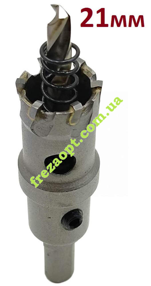 Данна коронка вважається універсальною. Вона ріже напайними твердосплавними пластинами. Аналізуючи відгуки користувачів і власні випробування, слід використовувати їх виключно по металу (саме використовування її для свердління отворів в листовому металі є найбільш доцільним). Також, вона без проблем буде свердлити деревину і похідні матеріали (плити), але краї різу будуть рваними (не охайними). Коронка має центровочне свердло з пружиною. Пружина призначена для виштовхування матеріалу з коронки.Габарити та характеристики: