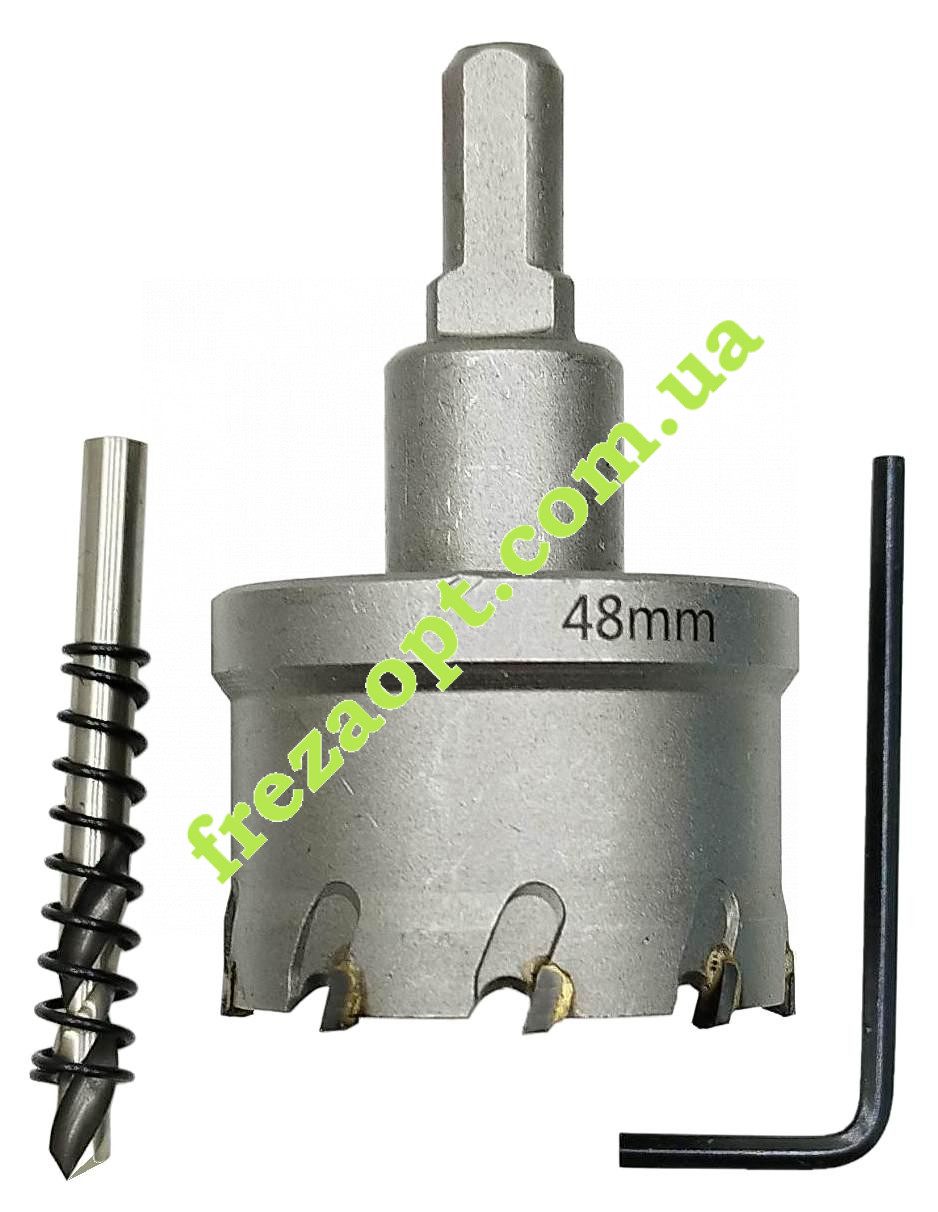 Данна коронка вважається універсальною. Вона ріже напайними твердосплавними пластинами. Аналізуючи відгуки користувачів і власні випробування, слід використовувати їх виключно по металу (саме використовування її для свердління отворів в листовому металі є найбільш доцільним). Також, вона без проблем буде свердлити деревину і похідні матеріали (плити), але краї різу будуть рваними (не охайними). Коронка має центровочне свердло з пружиною. Пружина призначена для виштовхування матеріалу з коронки.Габарити та характеристики: